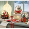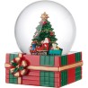 Carillon natalizio in resina e vetro, forma pacco regalo con boule de neige. Luci, movimento e dettagli curati. Misura 12×13×16 cm.